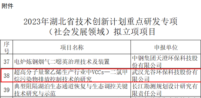 (技術(shù)研究院)近日,湖北省科技廳發(fā)布了《關(guān)于2023年湖北省技術(shù)創(chuàng)新計劃重點研發(fā)專項(社會發(fā)展領(lǐng)域)擬立項項目的公示》的通知,湖北聯(lián)投東湖高新集團(tuán)以旗下光谷環(huán)保為平臺申報的“超高分子量聚乙烯生產(chǎn)行業(yè)中VOCs—二氯甲烷污染物排放控制技術(shù)的研究”項目成功獲批立項,并獲批專項資金50萬元。這是公司首次作為牽頭與項目負(fù)責(zé)人單位獲批的省級重點研發(fā)計劃項目。