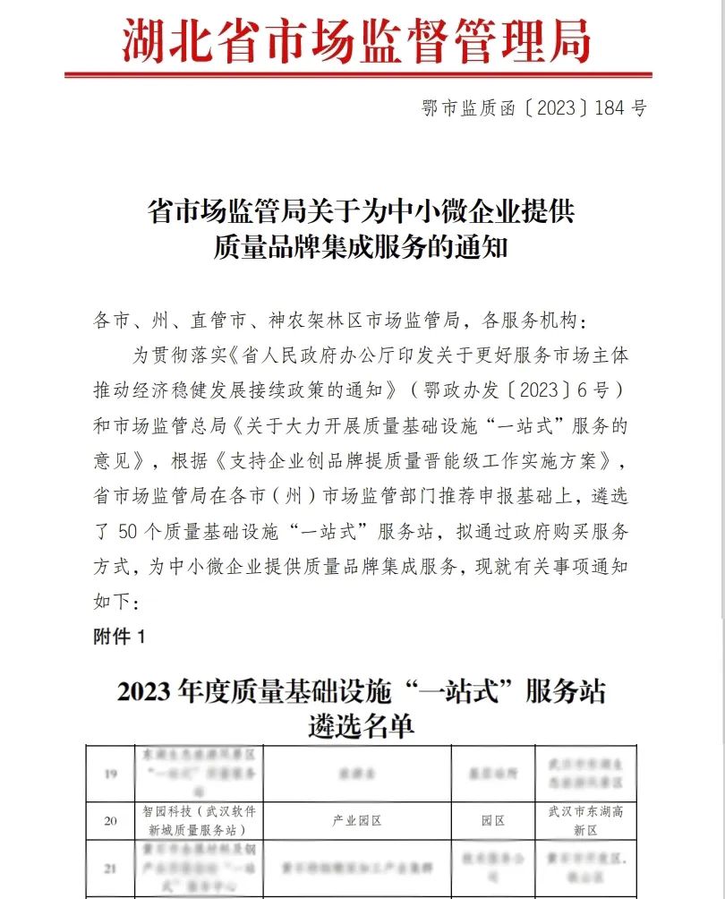 近日,湖北省市場監(jiān)督管理局發(fā)布2023年度質(zhì)量基礎設施“一站式”服務站遴選名單,湖北聯(lián)投東湖高新集團旗下智園科技運營的武漢軟件新城質(zhì)量服務站作為本年度新設立的服務平臺入選名單。