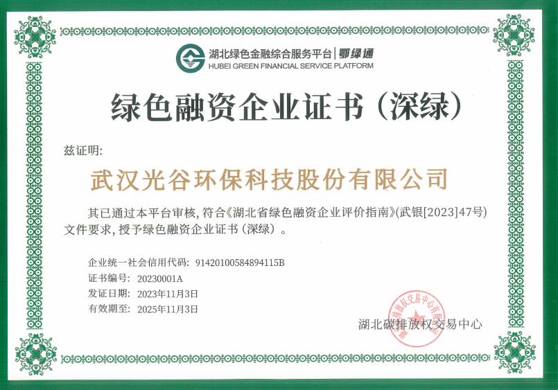 ▲光谷環(huán)保綠色融資企業(yè)證書(shū)(深綠)